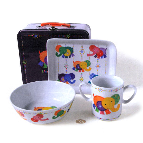 This is a kids' tableware set that comes with a bowl, a plate, a mug and a box. Each piece is printed with cute elephant patterns in brilliant colors. This tableware set will delight your little one instantly.