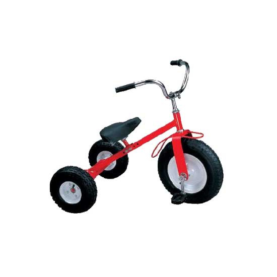 Shown here is a kids' tricycle in black, silvery and red colors. It features a padded seat for enhanced comfort. The sturdy frame ensures high durability.