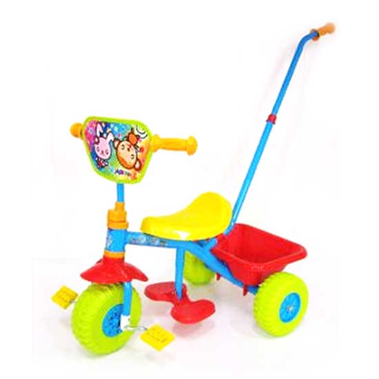 Displayed is a kids' tricycle that comes in a colorful design. Featuring a robust structure, this tricycle is easy to use. The handle on the back allows adult to push the tricycle for additional fun.