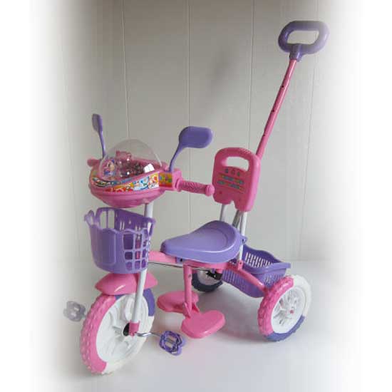 Displayed is a kids' tricycle that comes in a lovely pink-and-purple color scheme. Featuring a front basket and rear mirrors, this kids' tricycle will make the riding experience easier. There is a useful push handle at the back for parents.