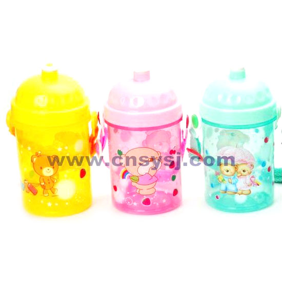 This is a water bottle with a very lovely and cute design. It is made of food-grade plastic with colorful cartoon patterns on the exterior. The bottle is designed with a strap for easy carrying.