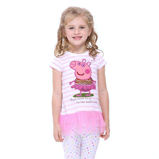 This kids' wear features a striped T-shirt and a pair of multi-colored, dotted pants. The T-shirt comes with a piggy image for a lovable look. Made of top grade fabric, this kids' wear brings your kids superior wearing comfort.