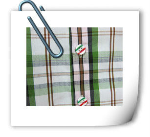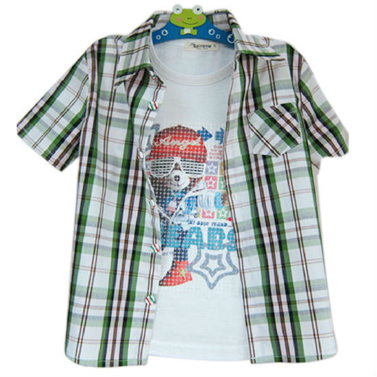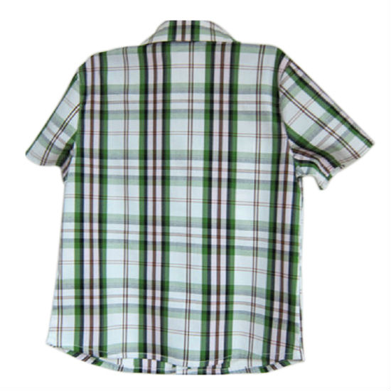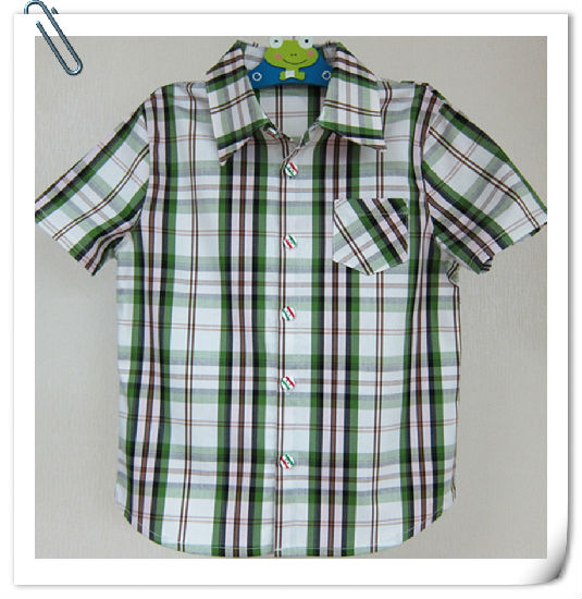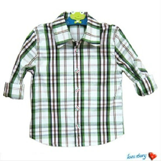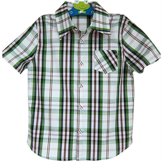 • Kids’ shirt in brilliant green, white and ochre checked pattern.