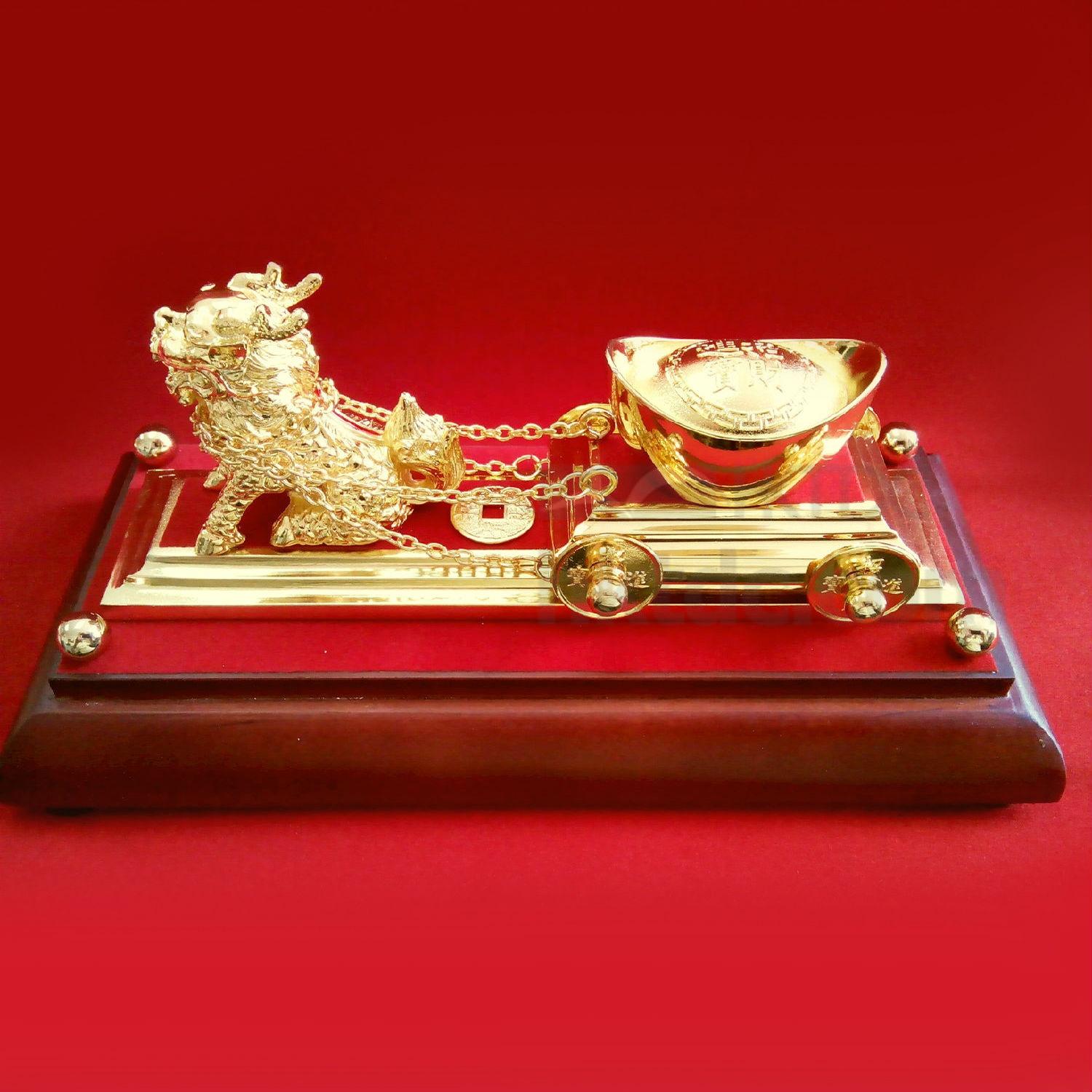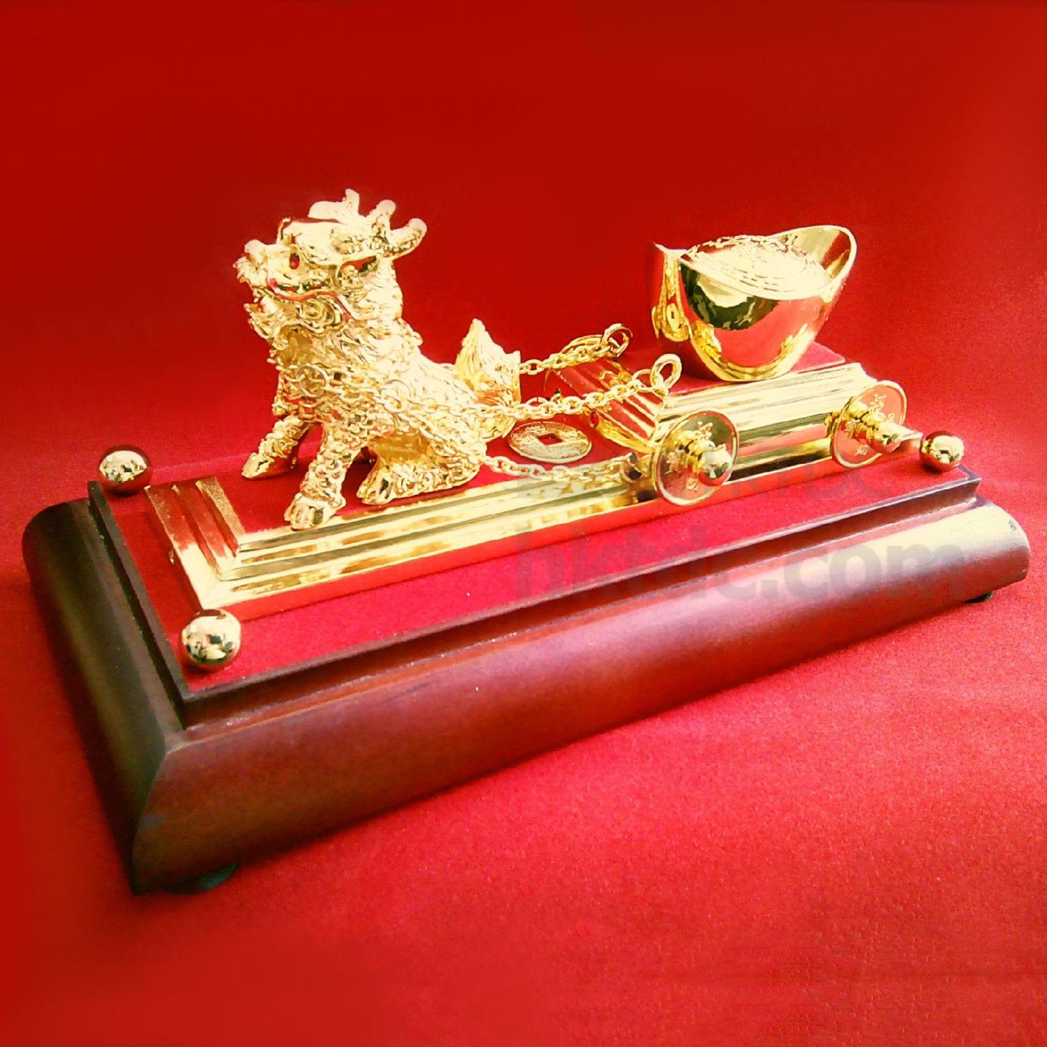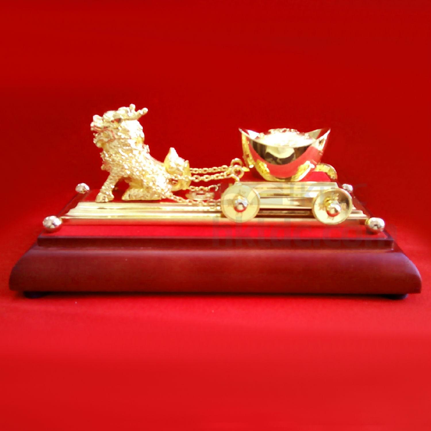 The highlighted item showcases a 2" gold-plated kirin with a wealthy cart. The ingot on top of the wealthy cart features four Chinese fortune words "zhao cai jin bao" which means fortune bringing. The same wordings can also be found on the four wheels of the carts and the four wheels are actually four fortune coins. The whole item is fixed on top of a brass stand and can be placed inside an acrylic box with a wooden set which can be used as a gift item.