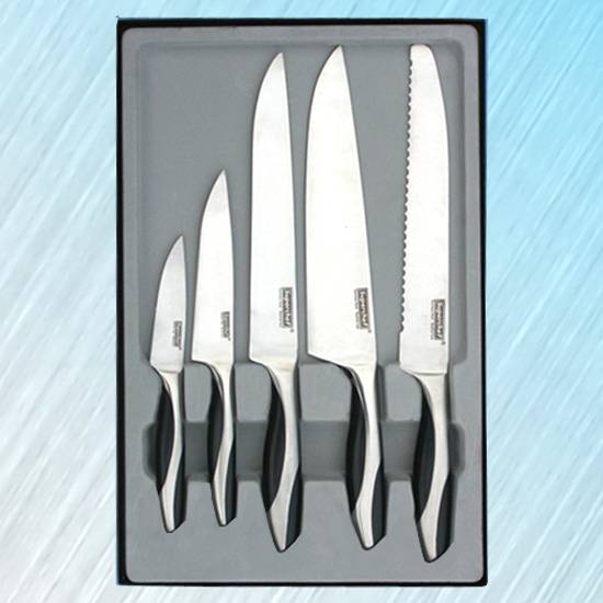 A professional kitchen knife set with forged blades and all stainless steel handles. The set includes five different sized knife. The set comes with a plastic tray.