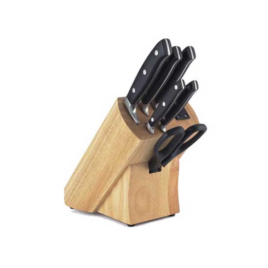 The kitchen set comprises six knives and one pair of scissors. It comes with a matching wooden stand for added convenience. This kitchen knife set is suitable for households and restaurants.