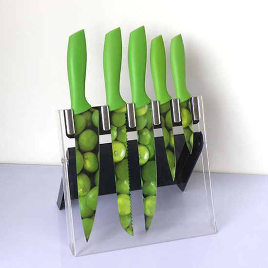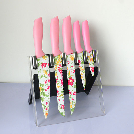 This is a 5-piece kitchen knife set with a chef knife, a bread knife, a carving knife, a utility knife and a paring knife. This knife set is designed with colorful prints for an attractive look. This knife set is made of stainless steel and PP for a long service life.