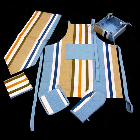 Featured here is a beautiful kitchen linen set that gives out a sense of stylish elegance. This excellent kitchen linen set includes an apron, an oven mitten, a pot holder, a bread basket and a kitchen towel. The striped kitchen linen set is simply an ideal addition to your kitchen.