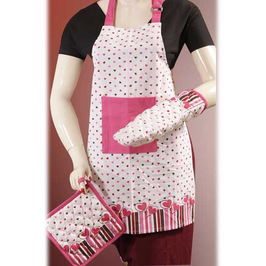 This kitchen linen set is comprised of an apron, an oven mitt and a pot holder. The allover heart patterns lend a sweet touch to the white appearance. This practical kitchen linen set is an ideal addition to your home.