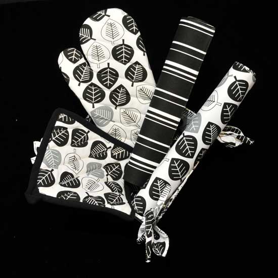 This sophisticated kitchen set includes an oven mitt, a pot holder, and two towels in coordinated designs. Made of high-quality cotton material, the items are extremely wear-resilient and durable. This deluxe kitchen set is a stylish addition to your kitchenware collection.