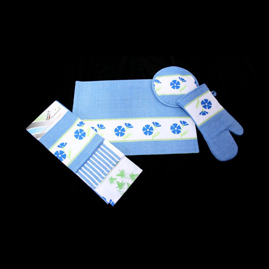 This adorable kitchen set features a kitchen towel, a baking glove, a place mat and a pot mat. Decorated with a simple flower print, this kitchen set is pleasing to the eye. Functional and pretty, this kitchen set makes your cooking and dining more pleasant.