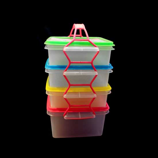 This rectangular multifunctional last box is idea for kitchen storage use. It features a transparent body and a colored lid for a stylish look. A unique hook with a handle is also available for easy carrying.