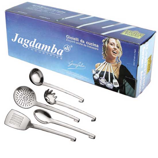 This set of kitchen tools consists of a ladle, skimmer, pasta server, basting spoon and turner. This five-piece kitchenware set features a mirror finish that adds a touch of elegance to your kitchen. This stylish and versatile set is an ideal cooking helper.