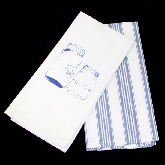Shown here is a series of kitchen towels made of quality fabric. The towel features prints of stripes and kitchen items in blue and white. The simple design brings a refreshing style to modern kitchens.