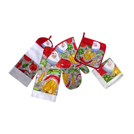 This is a 5-piece kitchen set containing a kitchen towel, an oven mitten, a pot mat and so on. They stand out from others with their cute vegetable patterns. There are various materials available to meet your needs.