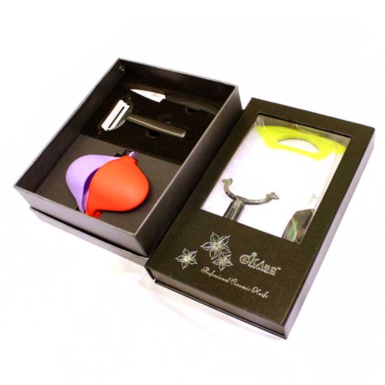 The kitchen utensil set includes a four-inch utility knife, a slicer and an anti-microbacterial cutting board. It comes with window box packaging for added class. This kitchen utensil set is a great gift for new couples.