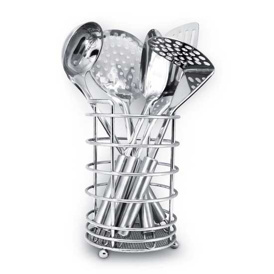 - Includes a spatula, a ladle, a spoon, a skimmer, a potato masher, and a holder.