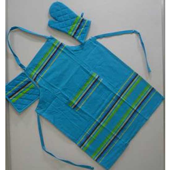 Featured is a beautiful kitchen utensil set with an apron, baking glove and pot holder. The items boast a cheerful design in sharp blue, highlighted by sharp green striped patterns. This kitchen set brings you full protection during cooking.
