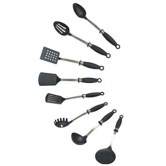 This is collection of modern kitchen utensils. The collection includes a variety of serving spoons and forks. All utensils are with rubber head and handle.