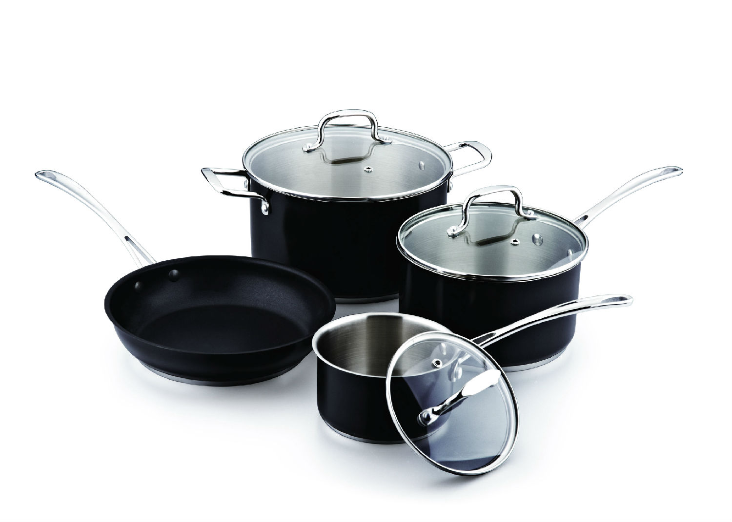 This kitchenware set includes three sauce pots in different sizes and a frying pan. The sauce pots come in a round shape and are matched with transparent lids. They are made of stainless steel and are available in charming colors.