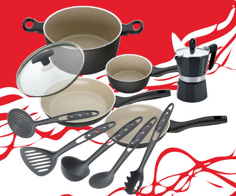 Demonstrated is a set of cookware including frying pans, a stock pot with glassy lid, cooking tools and a coffee maker. This versatile kitchenware features polished white interior with sleek black appearance, which is easy to clean. Made of quality materials, the cooking set promises you long term durability.