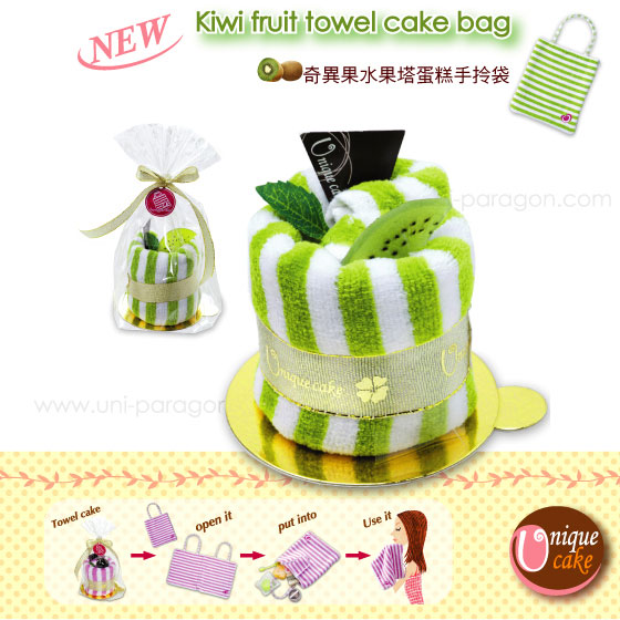 Featured is an adorable kiwi fruit tower towel cake. The towel is well woven and dyed with vivid colors. The cake is decorated with an eye-catching imitation kiwi. This chic item is perfect for home decoration. The cake can be unfolded to form a handbag.