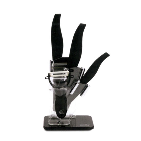 The knife set comes with 3 kitchen knives in different sizes. The knife stand is designed for keeping kitchen knives in place. The knives come with an ergonomic handle for a firm and comfortable grip.