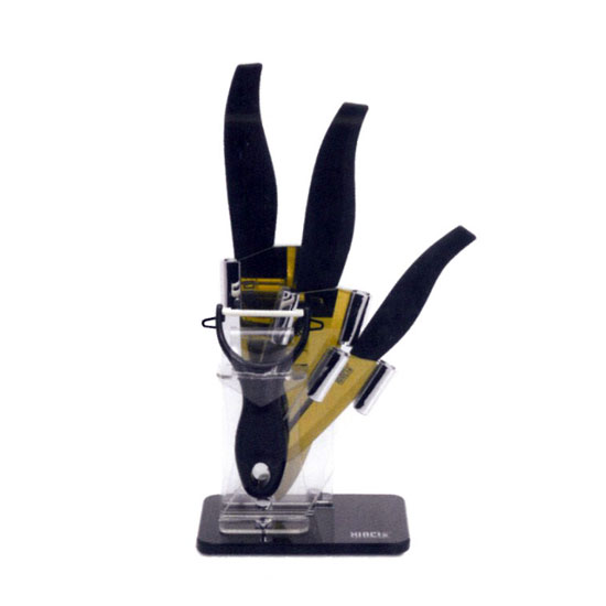 This knife set comes with 3 kitchen knives, a peeler and a knife stand. The knife stand features 3 slots for inserting knife blades. Made of quality acrylic, the transparent stand comes with a durable construction.