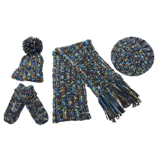 This set of knitted clothing accessories includes a hat, a beanie, a scarf and a pair of gloves. They are knitted with yarns of twisting colors for a look that stands out from the rest. The accessories can be made with various materials and sizes according to requests.