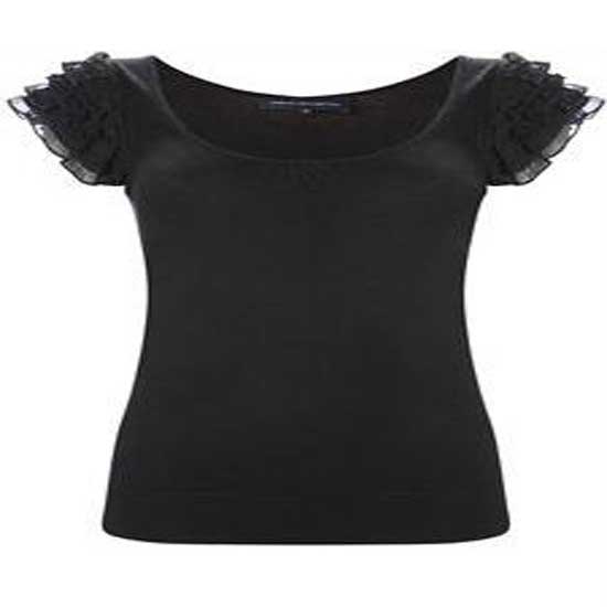 The frill top features a scoop neckline with frill detailing at crepe cap-sleeved shoulders. The soft cotton and wool-blend knit top provides comfortable fit for wearers. You can match the top with your skirt or pants.