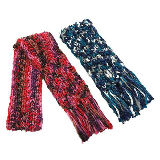 Pictured are scarves knitted with different yarns like acrylic, polyester, viscose, wool, angora or other blended yarns. The contrasting blend of colors suggests a more fashionable touch. These scarves are perfect accessories to keep you warm in the chilly days.