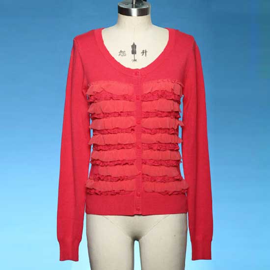 This pictured pinkish cardigan features a button-front closure and a scoop neck. The ruffle details add a touch of elegance to the cardigan. It is well made of 70% rayon and 30% nylon for comfortable wearing experience.