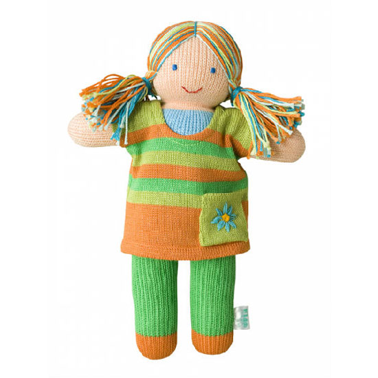 This knitted doll is delicately made by hand. It comes with the design of a little girl in a striped dress. Made of natural materials, it is safe for children to play with.