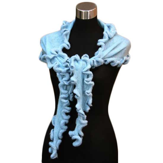 Displayed here is a knitted scarf made of acrylic mohair. It flaunts ruffles for added elegance. Highlight your outfits with this knitted mohair scarf.