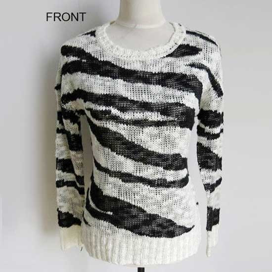 This knitted pullover is made of 100% acrylic belly yarn to ensure wearing comfort. It comes with long sleeves and a round neckline. The neckline, hemline and cuffs are crafted with stripped patterns for extra style.
