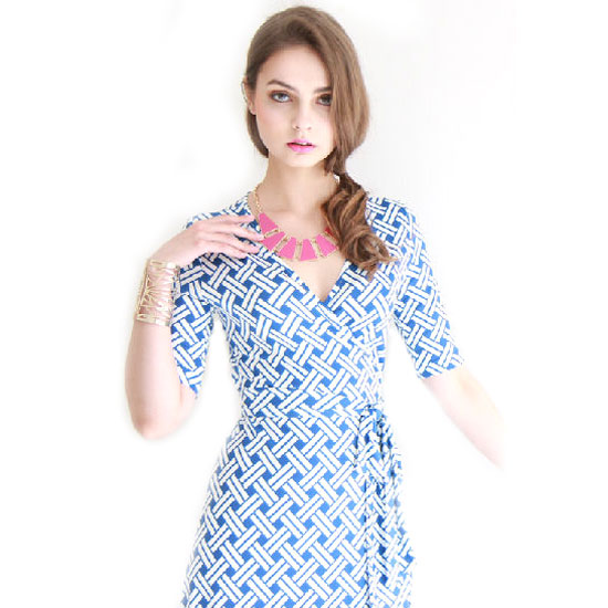 This is a women's knitted wrap dress with a chic and stylish design. It features a deep V neckline, 1/2 sleeves, and a bow embellishment on the waistline. The charming patterns accent this design for added style.