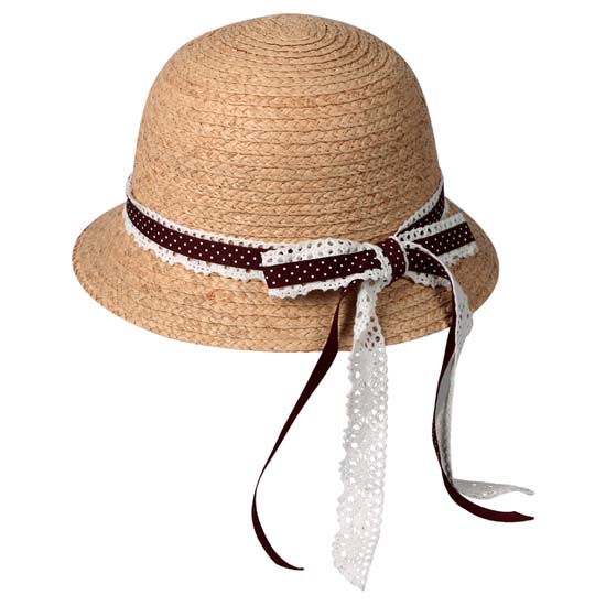 Pictured is a round-shaped hat made of durable materials. The bottom of its crown is trimmed with an engaging knot. The knot features a nice polka dot design with charming lace.
