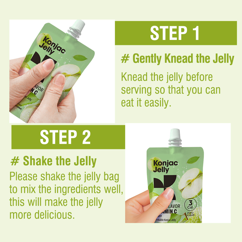 Before eating, please gently squeeze the jelly bag to fully crush the jelly so that it is easy to suck out. Another point is that our jelly bags are recyclable!