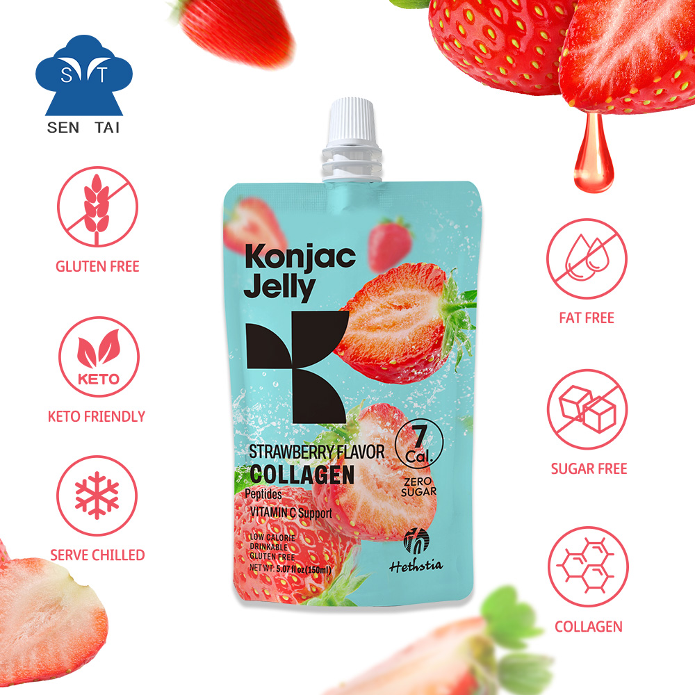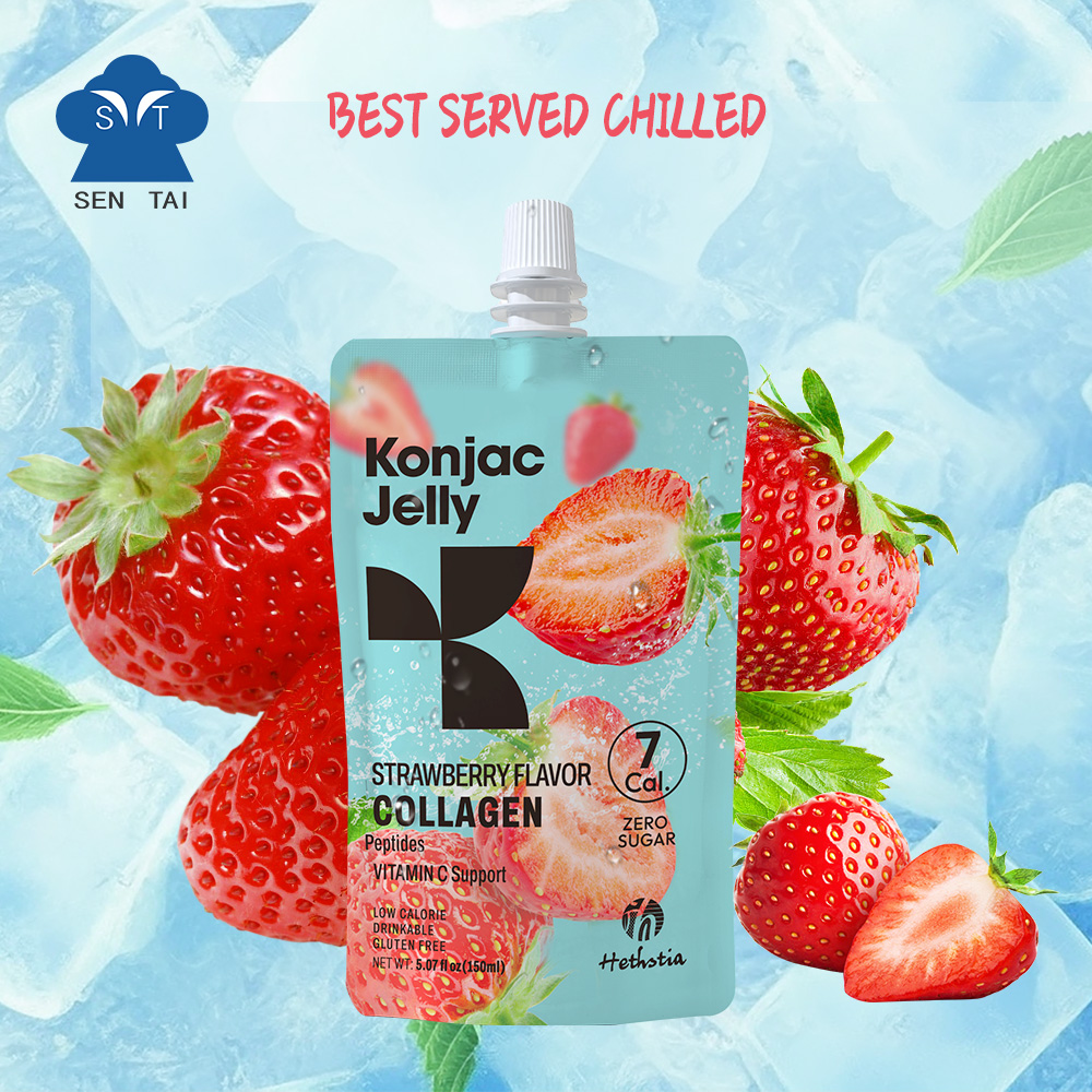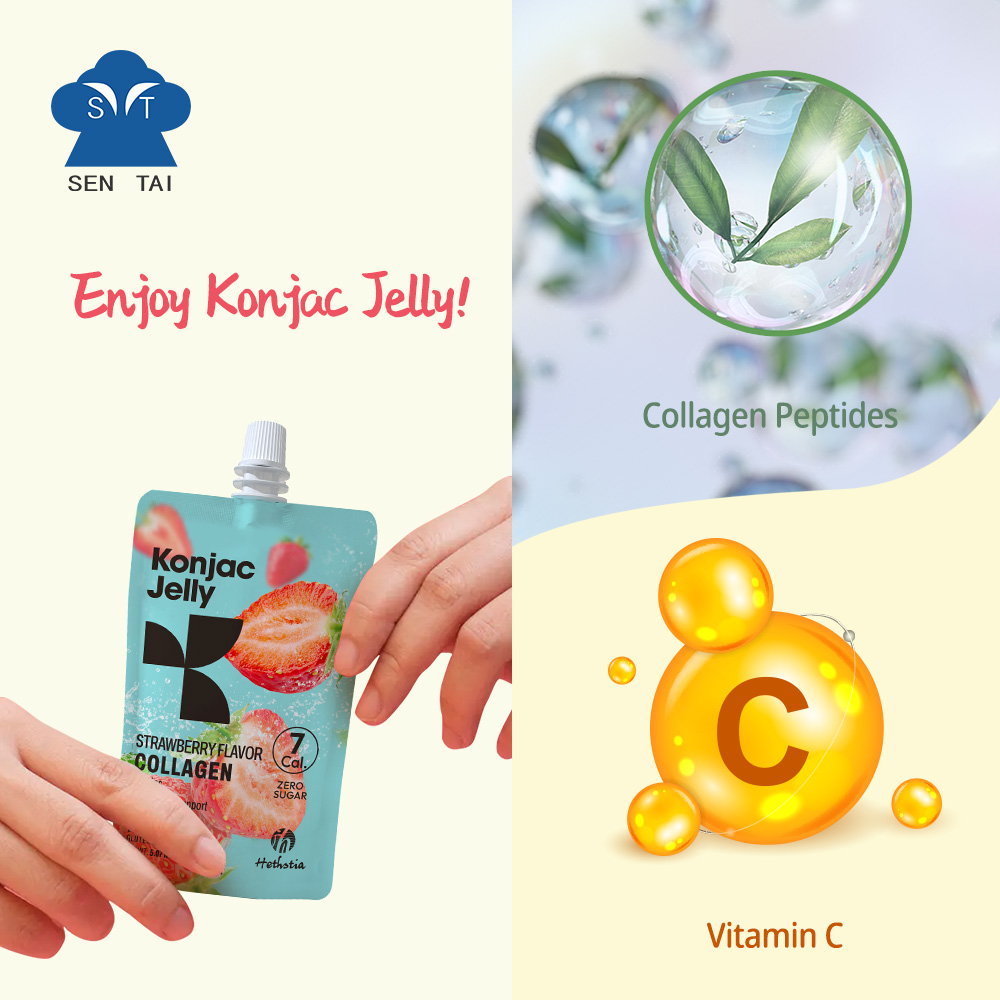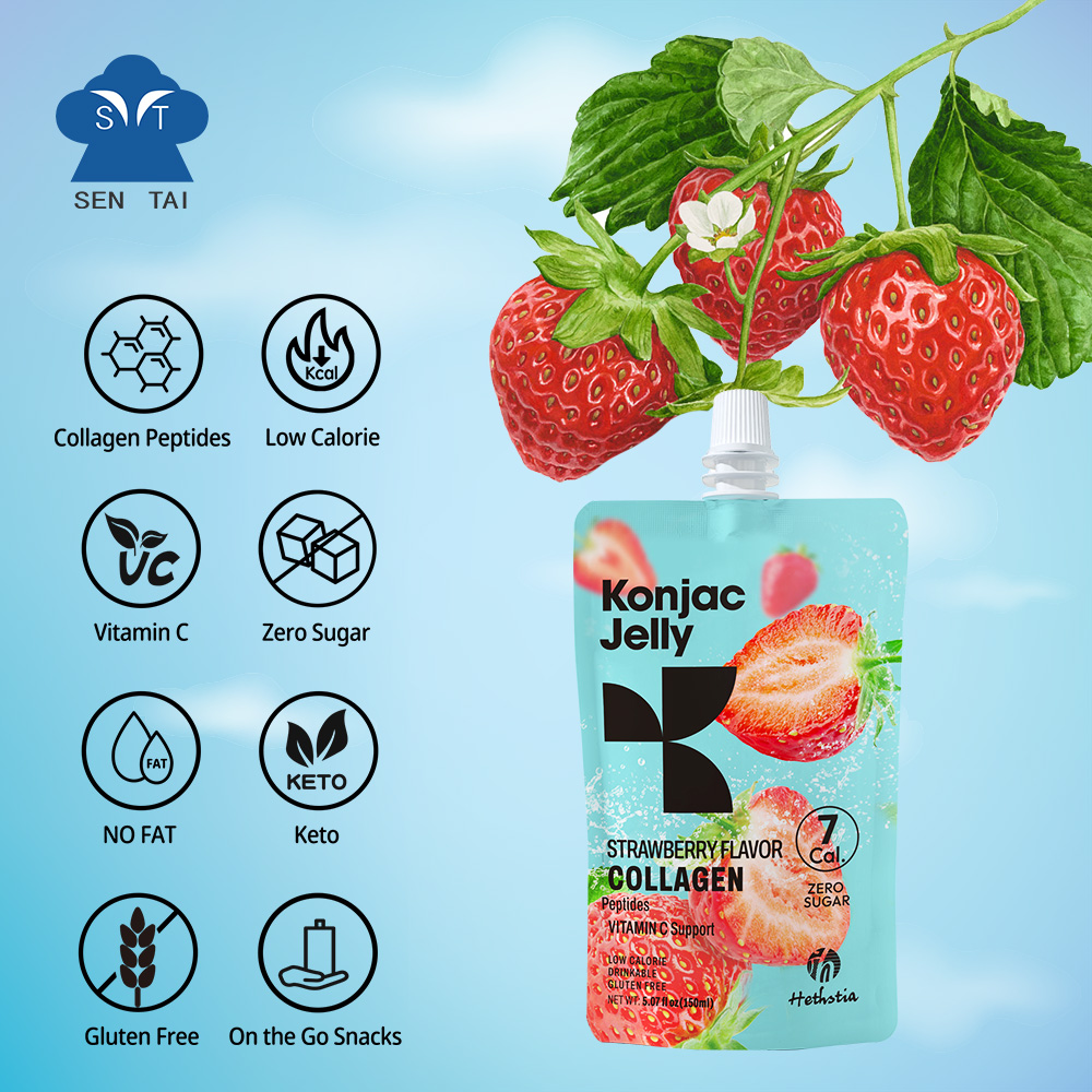 Sentaiyuan’s newest Konjac Powder Jelly, available in Strawberry, Apple, Green Grape, and Passion Fruit flavors, is perfect for hot summer days. This package contains 150 grams of strawberry-flavored konjac jelly—only 3 kcal per 100ml!