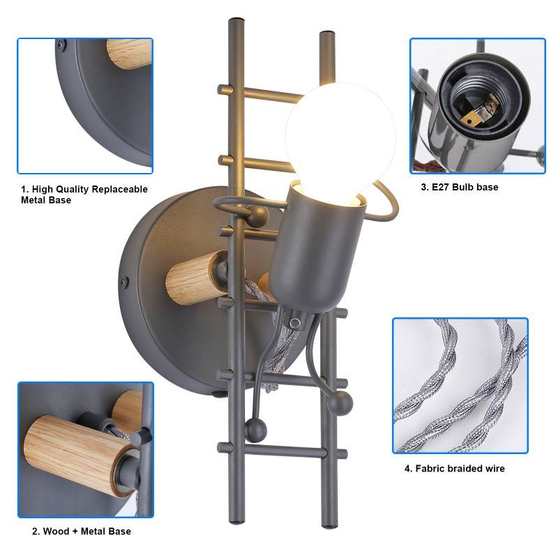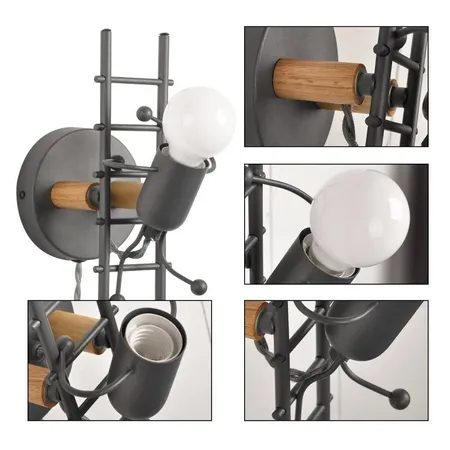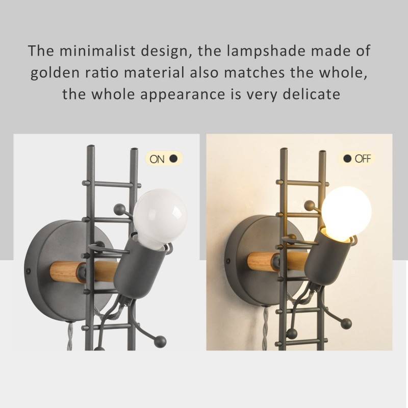 Decorative wall-mounted dolls are suitable for articulated dolls in original shapes. Design based on dolls climbing stairs. Made of high-quality wood and aluminum, the color can be selected: green and white. The led lamp holder e27 serves as the head and has a maximum power of 40w.