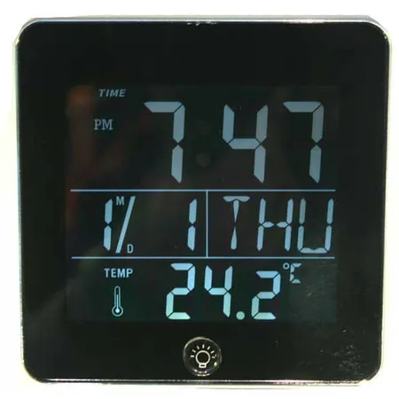 The LCD clock features alarm and 3-minute snooze functions. It comes with temperature, date and day of the week display. This LCD clock can be lighted for clear viewing at night.