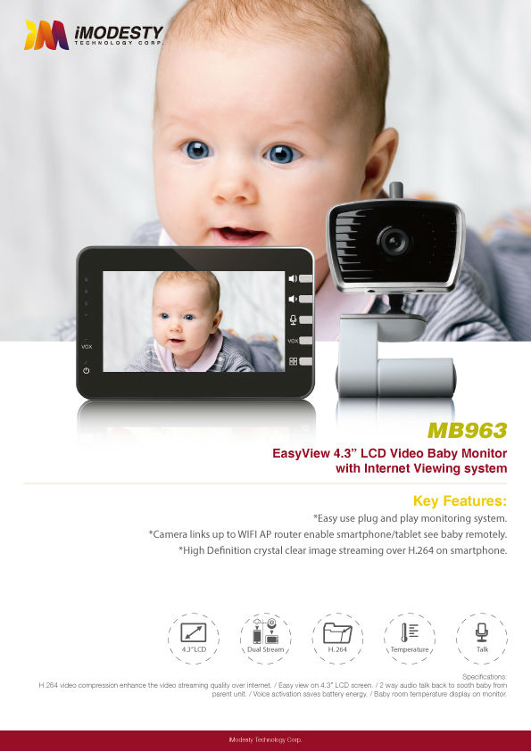 • H.264 video compression enhance the video streaming quality over internet.Easy view on 4.3' LCD screen.2 way audio talk back to sooth baby from parent unit.Voice activation saves battery energy.Baby room temperature display on monitor.