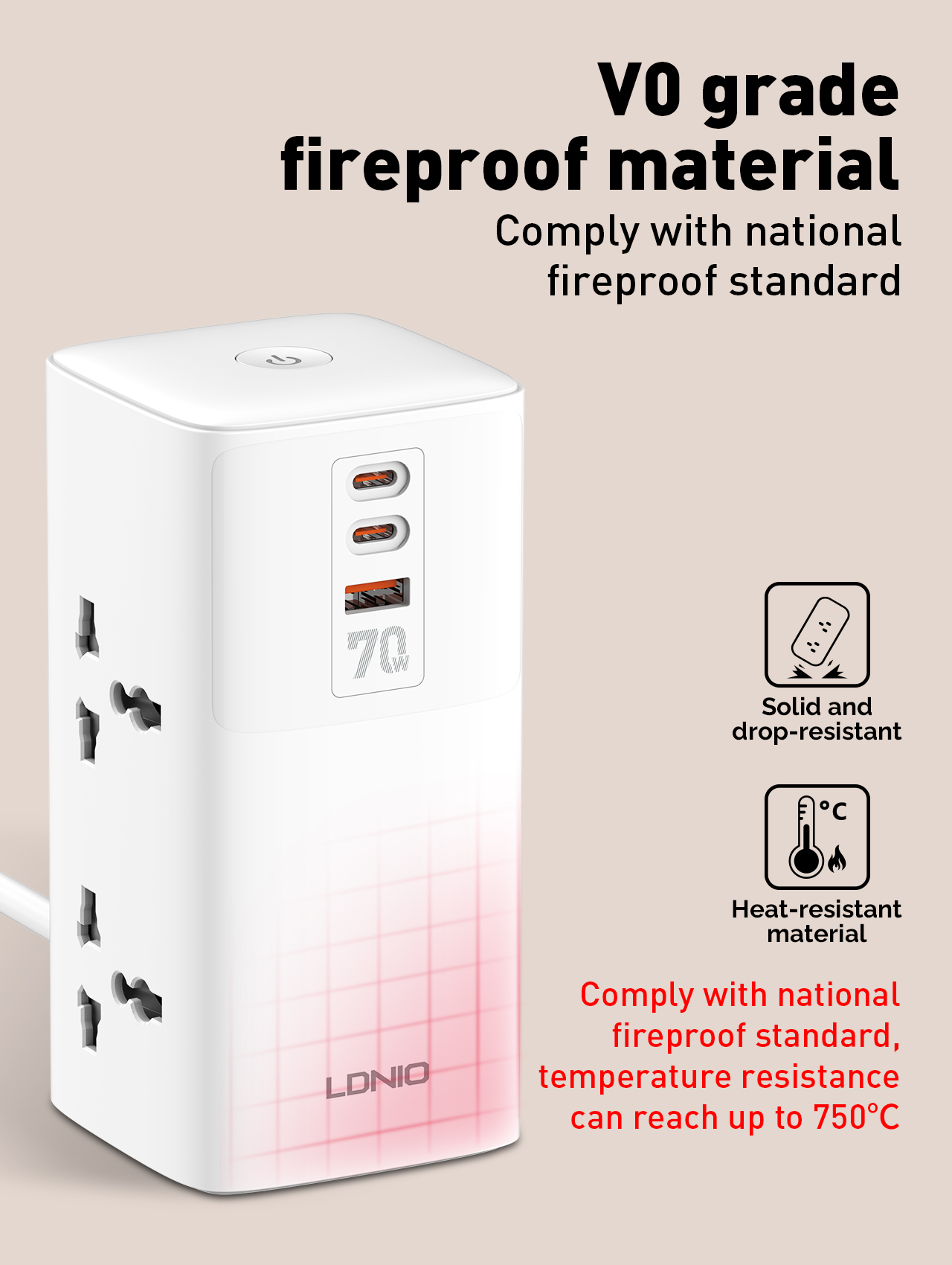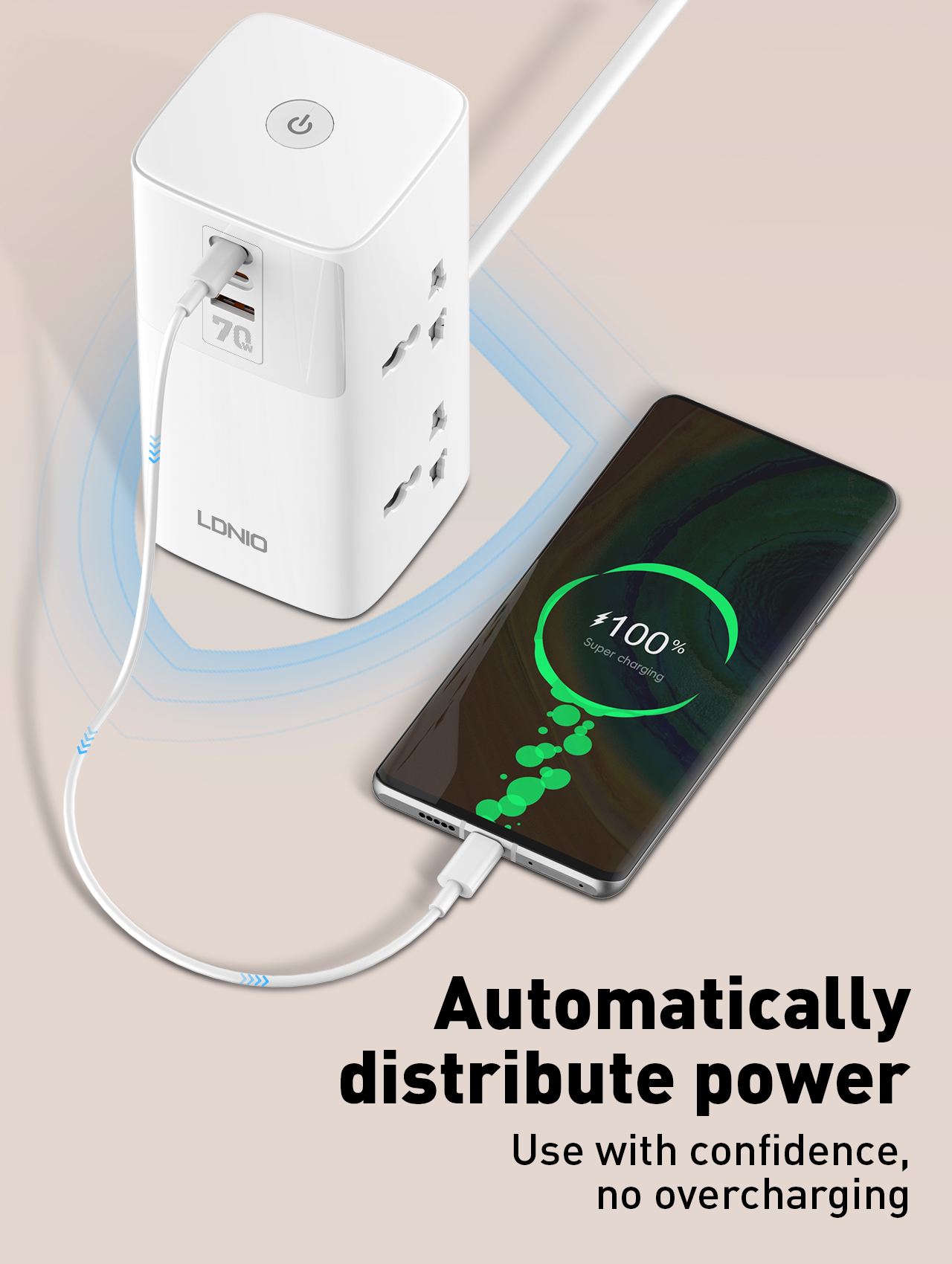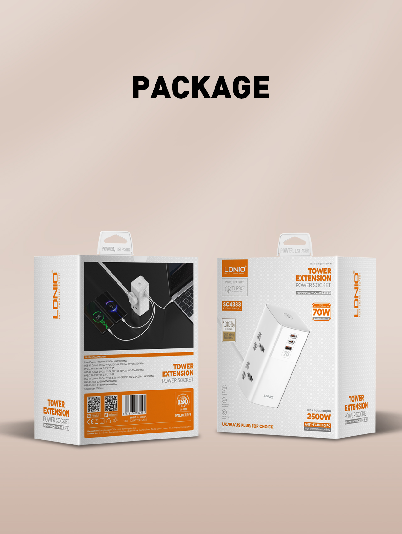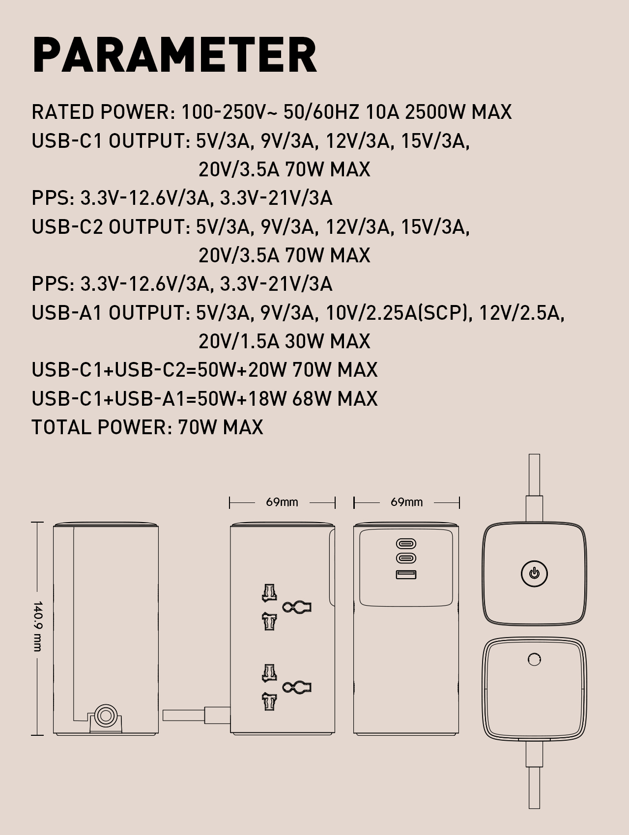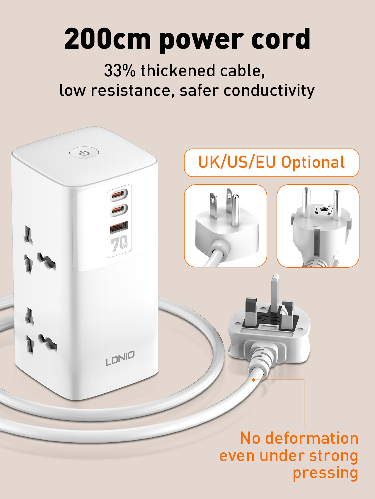 2500W Tower Extension Power Socket+70W Super Fast Charging:2USB-C+USB-A