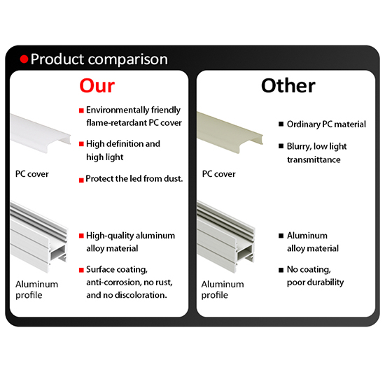 1. Aluminum profile: It's made of high quality aluminum alloy 6063-T5 material, surface coating, anti-corrosion, no rust and no discoloration.