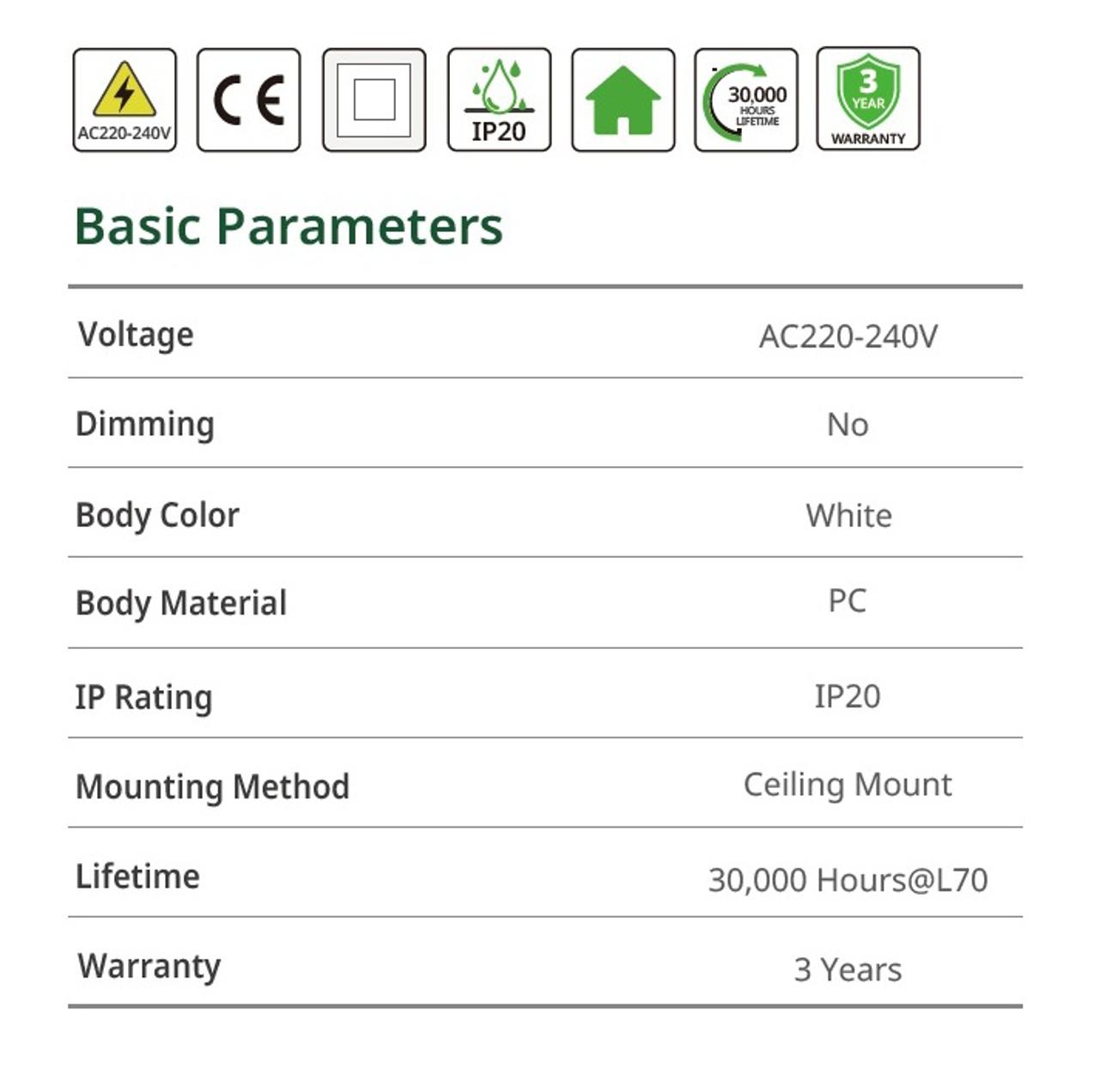 Ultra-thin design - Frameless PC cover / PP body, Frosted diffuser with uniform illumination, Round or Square design available, Soft/Glare-free light, Easy installation