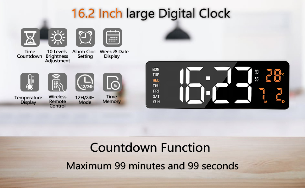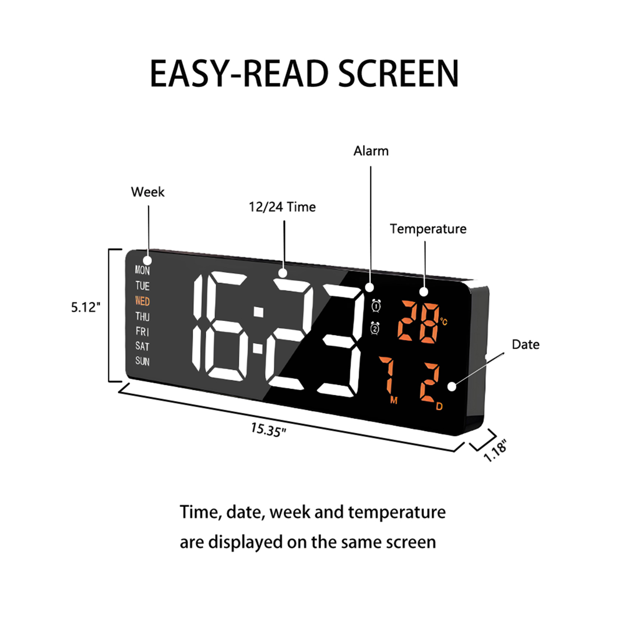 16.5 Inch Display: The digital clock has a 16.5-inch display that shows the time, date, day of the week and temperature simultaneously. Nearly 4-inch high contrast clear numbers are easier to read even from a distance and from all angles