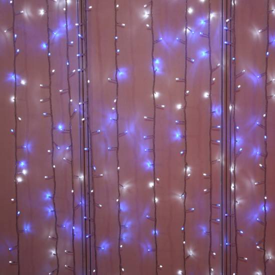This is a set of LED curtain light with blue and white light bulbs. The whole curtain is a good decoration which gives a waterfall effect. It can be extended horizontally.