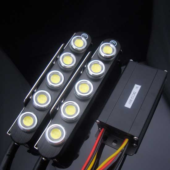 This DRL (daytime running light) is to be installed on the front of a car. It automatically switches on when the vehicle is moving forward, giving lights to increase the conspicuity of the vehicle during daylight conditions.