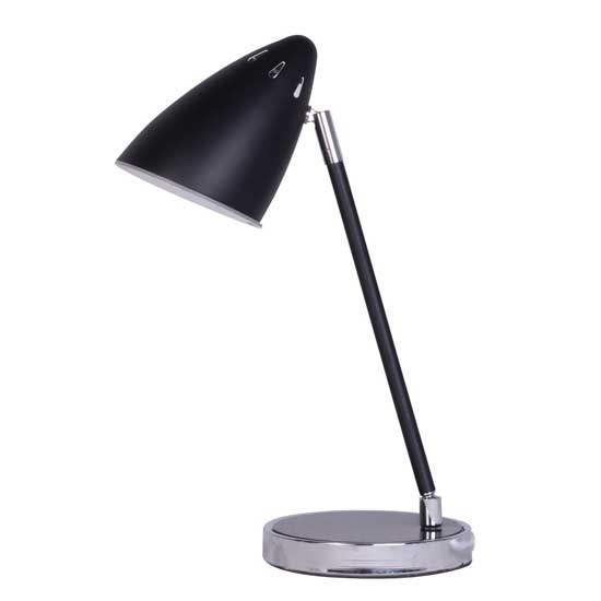 This LED desk lamp features a cone-shaped lamp shade in a matte black finish. The top-quality LED desk lamp emits soft and comfortable light for reading or detailed work. The flexible lamp arm can be easily adjusted for different beam angles.