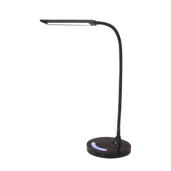 Displayed is an LED desk lamp coming with an allover black finish. The round base allows the lamp to stand firmly on the desk. It delivers pleasant illumination of up to 250 lumens.